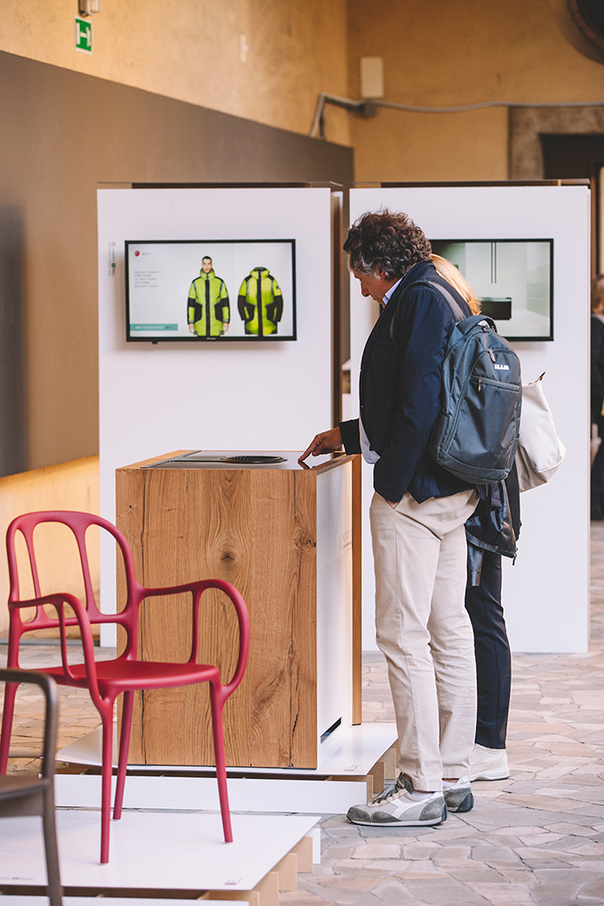 Un progetto di allestimento pensato per essere montato e smontato agevolmente, che nasce dallo stimolo della narrazione; sono fogli bianchi (alucobond) con una piccola piega da libro gli elementi su cui si fissano, si appoggiano i prodotto selezionati per il Compasso d'Oro.