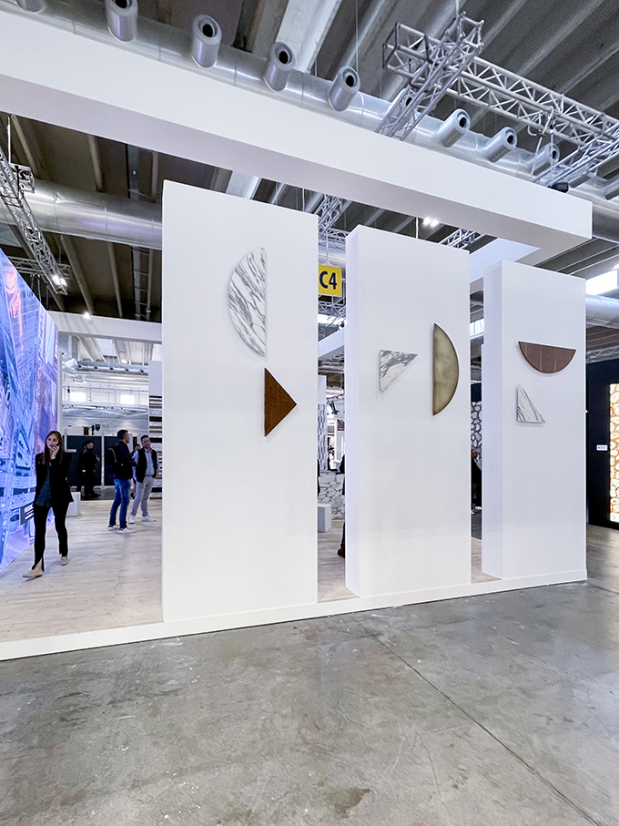 An exhibition space that focuses on the new Savema architectural surfaces, designed by the architect Francesco Benacci and with interventions by Gumdesign - the company's art director; the stand presents different levels of communication through analogue and digital means: the large video wall projects images of the quarries, the company and the processing of the raw material while the totems display the material contaminated by other materials, surfaces designed by Gumdesign that work on the marble slab and with natural materials (wood, metal, leather, cork, willow) with great attention and sensitivity. Outside, the totems communicate the material contaminations through the signs of the company brand, real innovation of design language and production technique.