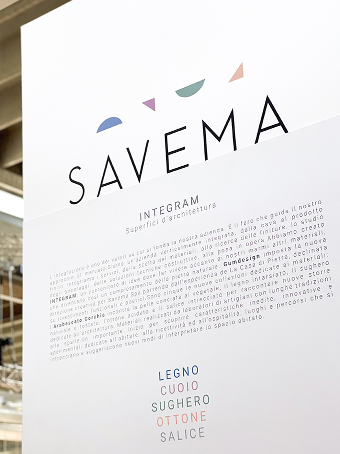 Uno spazio espositivo che mette al centro le nuove superfici di architettura Savema, progettato dall'architetto Francesco Benacci e con interventi di Gumdesign - art director dell'azienda; lo stand presenta diversi livelli comunicativi attraverso mezzi analogici e digitali: il grande videowall proietta immagini delle cave, dell'azienda e delle lavorazioni della materia prima mentre i totem espongono la materia contaminata da altri materiali, superfici progettate da Gumdesign che lavorano sulla lastra in marmo e con materiali naturali (legno, metallo, pelle, sughero, salice) con grande attenzione e sensibilita'. All'esterno i totem comunicano attraverso i segni del marchio aziendale le contaminazioni materiche, innovazione vera e propria di linguaggio progettuale e tecnica produttiva.