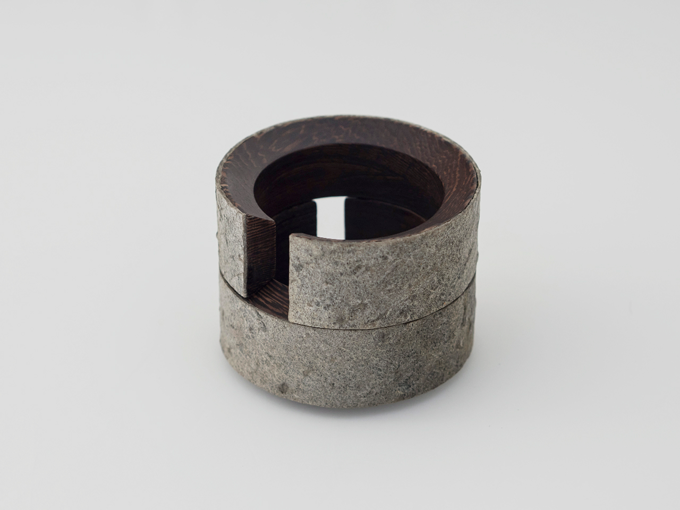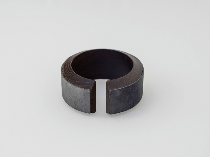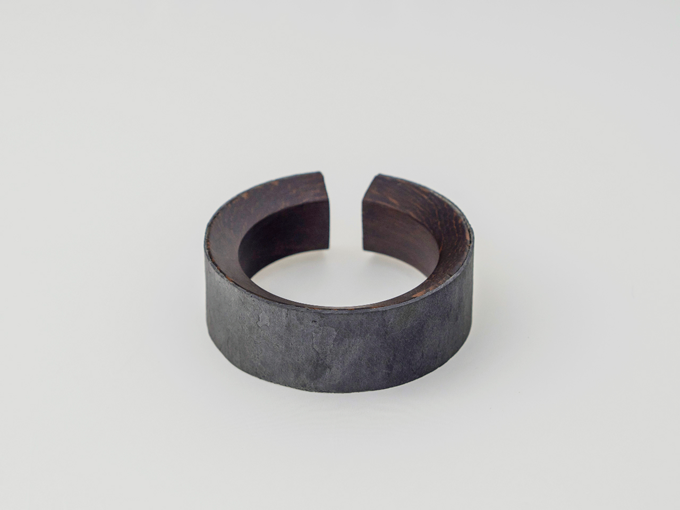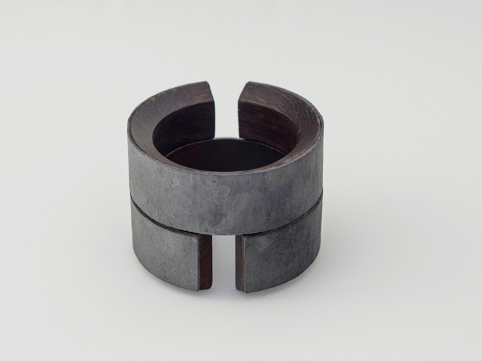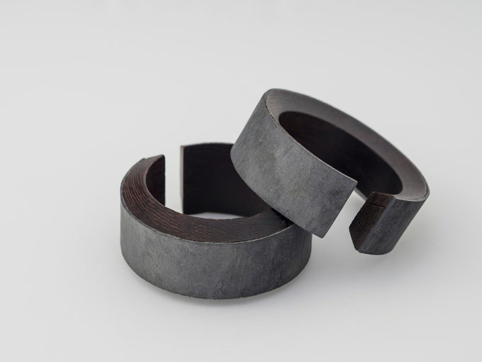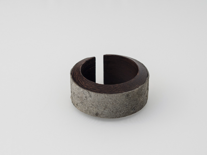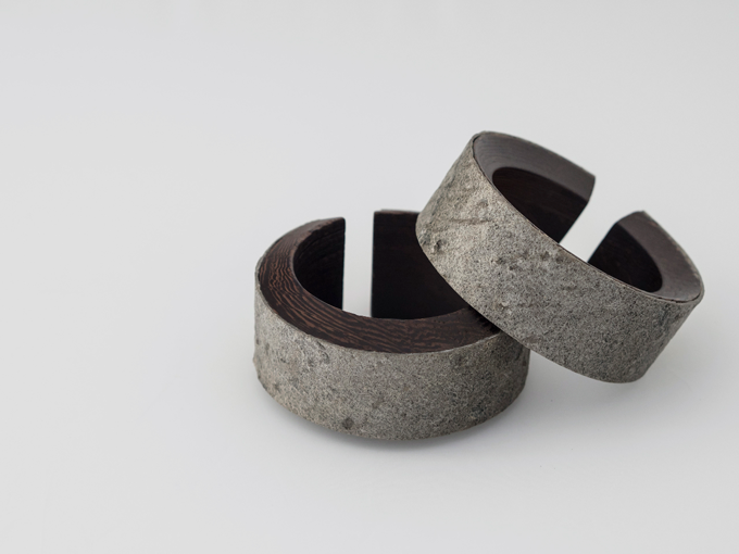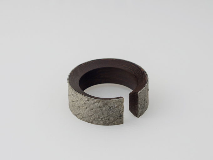 Materic and perceptive contrast highlight decorative elements for the body. A bark, an armour, sometimes natural at times synthetic in a paradoxical description of the inside/outside, body/soul. The thin stone is applied to natural wood essences.