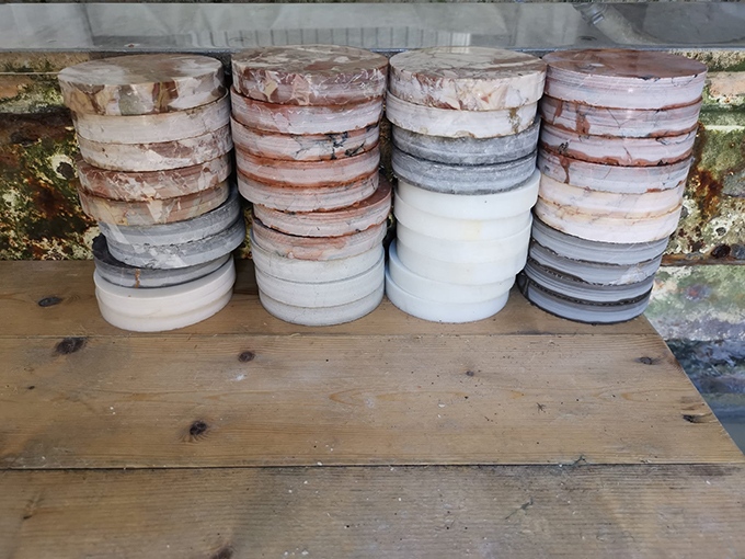 Natural materials recovered from the square of the Sicilian Cusenza Marmi laboratory which - by choosing processing waste from local marble slabs - allows to give a second life to a precious, unique and unrepeatable raw material with which to generate new functional objects thanks to the craftsmanship (finishing and cutting) and digital technology (waterjet, laser) applied to the product; a contamination necessary to approach high craftsmanship and project it into creativity and contemporary design.