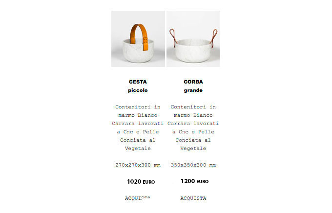 Contenitori, portafrutta, centrotavola trasportabili e pronti per essere portati in tavola. Con i loro manici e maniglie in cuoio, i contenitori in marmo riprendono la forma tradizionale della cesta riportando alla memoria la vita rurale di chi, con dedizione e cura, riempie le corbe in vimini del proprio raccolto per portartarle in casa.