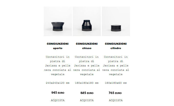 The container, unique in its geometric shape, made of Tunisian stone, is returned to numerical control to complete three different shapes in leather, beaten on wooden molds, through a close fitting that determines the different possibilities of use.