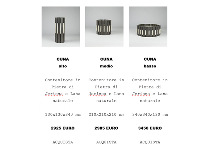 Cuna e' l'unione tra Pietra di Jerissa e lana toscana, due materiali provenienti da luoghi distanti che trovano incontro nel Mar Mediterraneo, da millenni culla di scambi culturali.