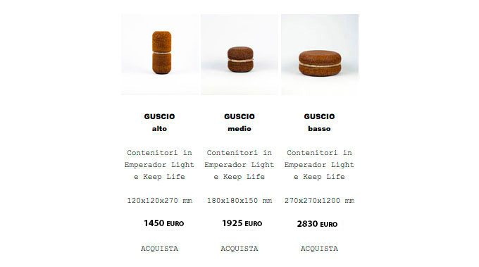 The collection is composed of three storage elements in Trani Stone, Lavic Stone and Emperador Light and a part above in Keep Life to preserve - acting as a stopper - and to generate - it can be used as a soil for sprouting. Digitally processed. Keep Life is a new composite material, ecological and malleable, made from the shells of the fruits of hazelnuts, chestnuts, walnuts, almonds, pistachios, peanuts, etc.. with a harmless binder, free from solvents and formaldehyde.