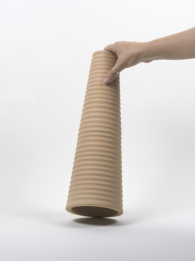 Un grande portacandele per una piccola luce portata alla sommita' dalla stessa struttura ceramica. Il materiale e' rappresentativo della ricerca, deriva dalla lavorazione di scarti che Tapinassi ha evoluto in una mistura brevettata ed ancora non utilizzata, antica, ricca di storia e tradizione.