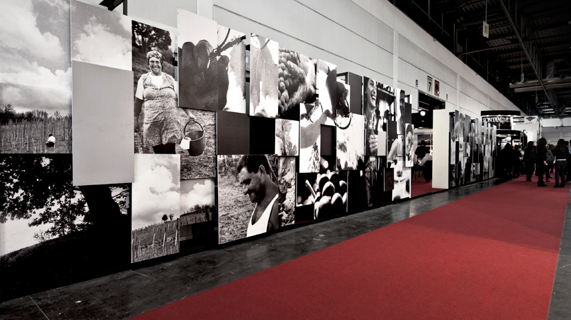 L'obiettivo è stato quello di creare uno spazio funzionale ed aperto al contract; uno spazio comunicativo che, attraverso le immagini in bianco e nero, riuscisse a trasmettere l'emozione ed il coinvolgimento delle persone che lavorano intorno al mondo del vino. Il risultato ha fornito una "cortina visiva" di circa 30 metri lineari, un'esplosione di fotografie capaci di comunicare terra, uva e persone; comunicare emozioni attraverso le espressioni dei luoghi, degli oggetti e dei visi ha permesso un impatto immediato nei confronti dei visitatori. Uno spazio trasversale e "diverso", pronto ad elevarsi e a farsi notare per il linguaggio temerario e deciso; un'immagine forte e contemporanea per un'azienda dinamica e pronta al cambiamento grazie ad un imprenditore giovane ed illuminato, colto e pronto alla sperimentazione. I luoghi diventano elemento primario e sono esposti per far comprendere la vita quotidiana, semplice, pura e genuina. L'intero progetto è stato studiato per essere flessibile e per adattarsi a dimensioni diversificate, a seconda della fiera. |